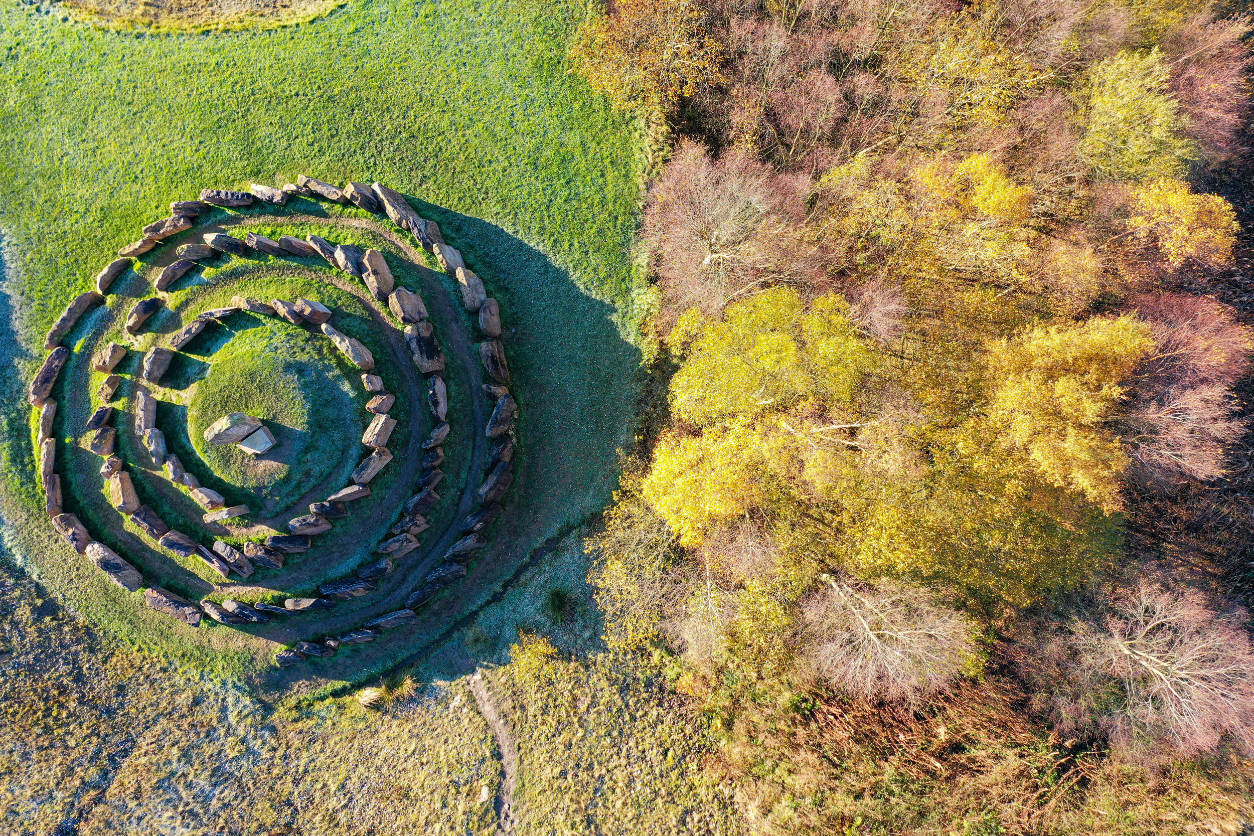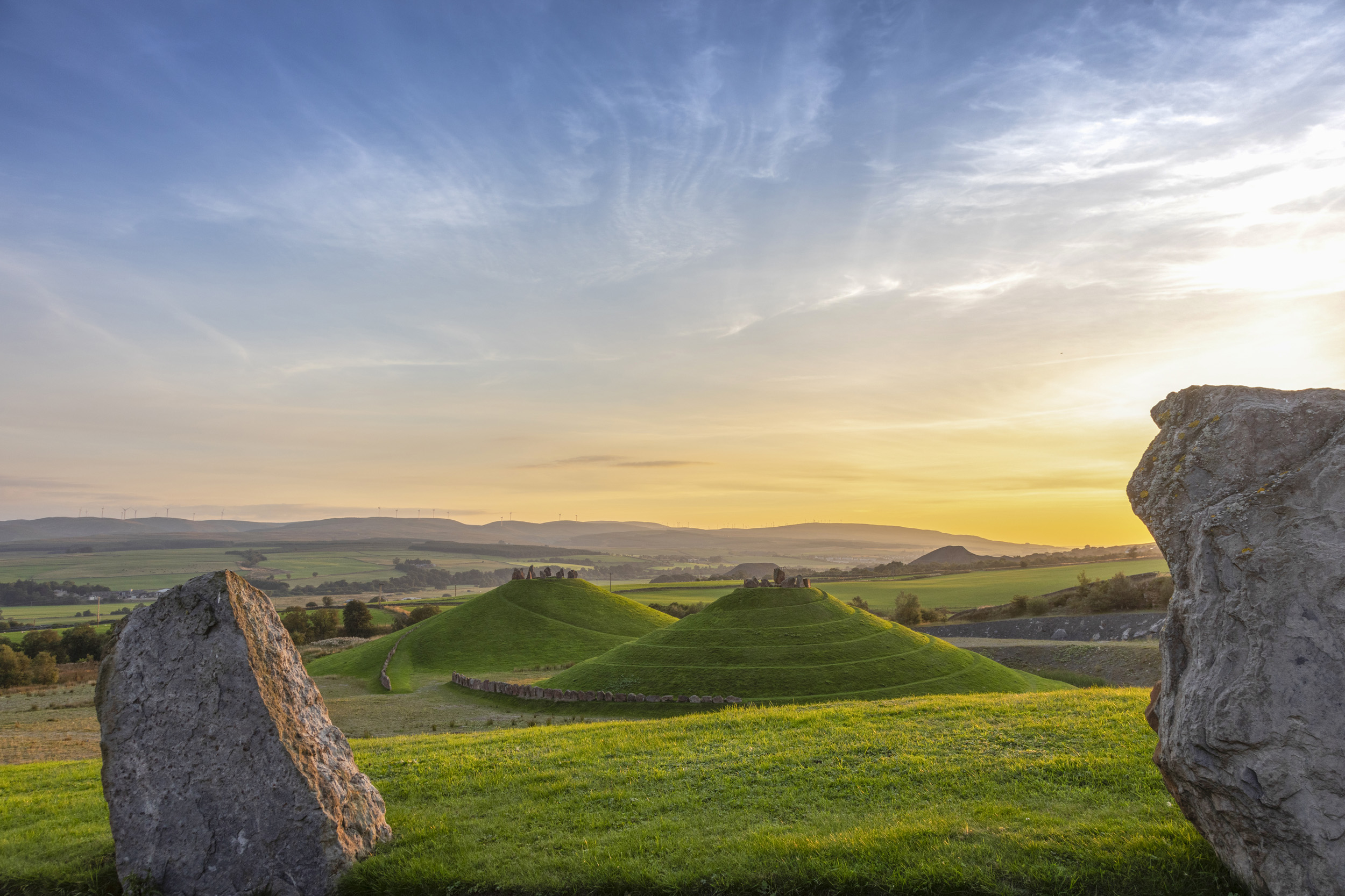 Jencks designed Crawick Multiverse to explore cosmology, prehistory, and connections to the past through the theory of the ‘multiverse’. Features in the landscape convey a sense of the universe and its rhythms, from the standing stone avenue through the North-South Line, which evokes prehistoric stone monuments like the Neolithic Calanais (or Callanish) Standing Stones on the Isle of Lewis, to the Omphalos, which signifies both the geological and mythical interior of the Earth.