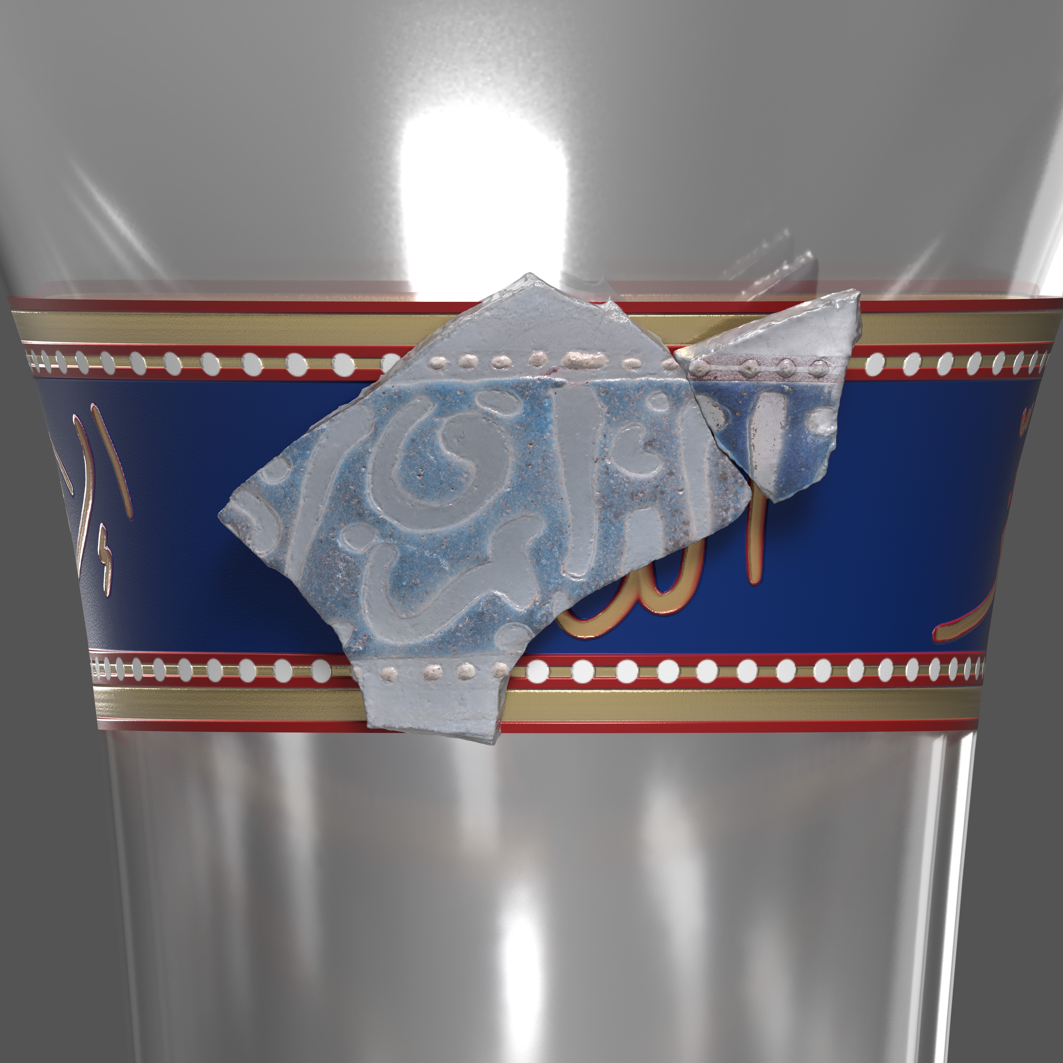 Stirlingshire-based visual artist Alice Martin researched contemporaneous medieval Islamic glass and worked with a team of experts from HES who used state-of-the-art techniques to analyse the fragments and produce 3D data. This enabled Martin to create a 3D-model digital reconstruction of the glass fragments to show what the beaker might have looked like originally.